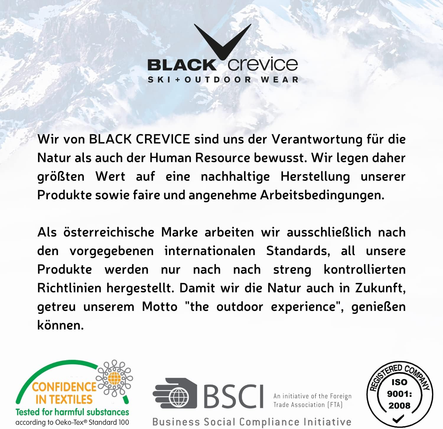 - BLACK CREVICE – Jako austriackie przedsiębiorstwo wiemy, co jest ważne w wyposażeniu zimowym i outdoorowym Puncto. Nasze produkty łączą w sobie optymalną ochronę z najwyższym komfortem noszenia