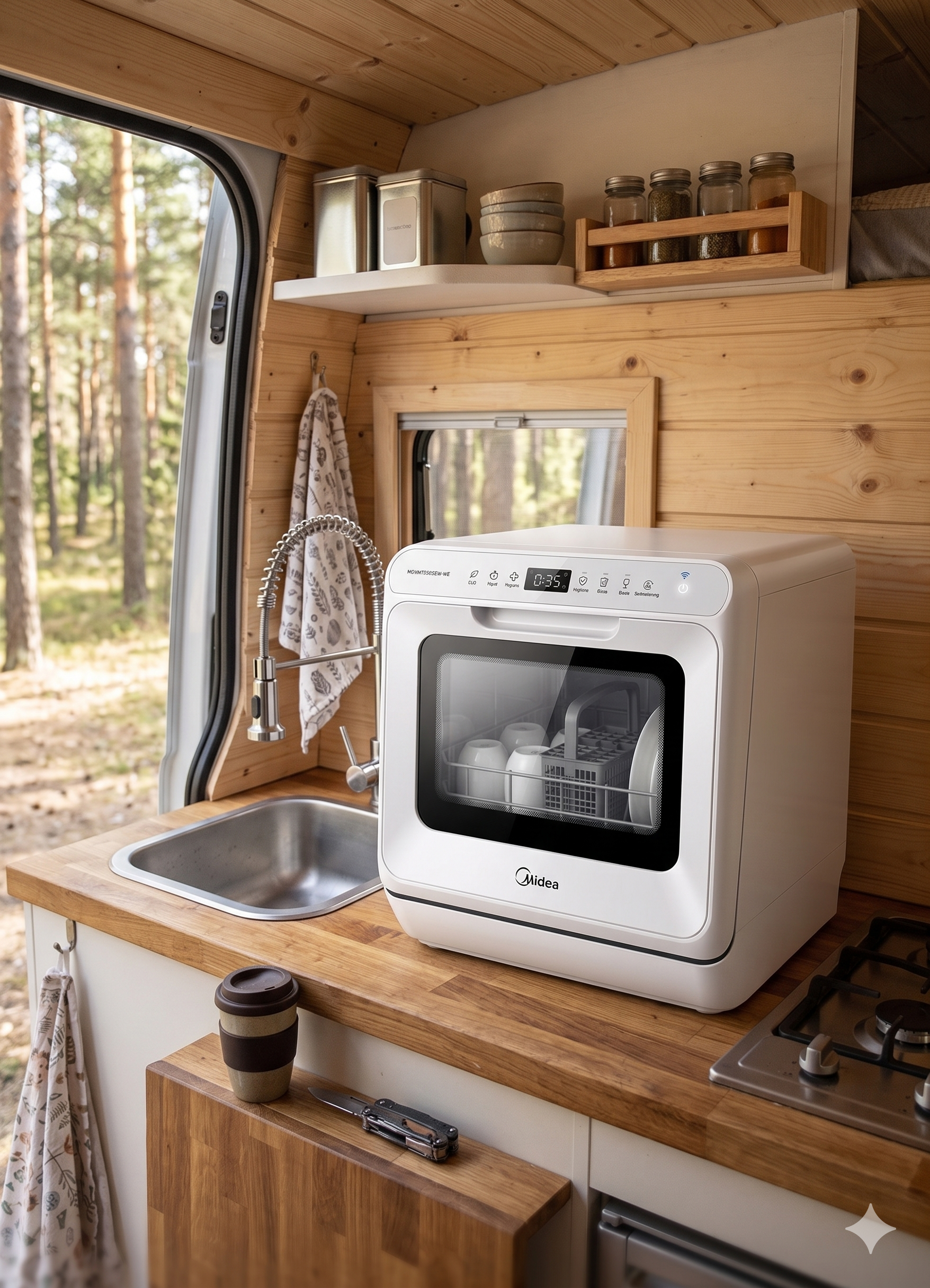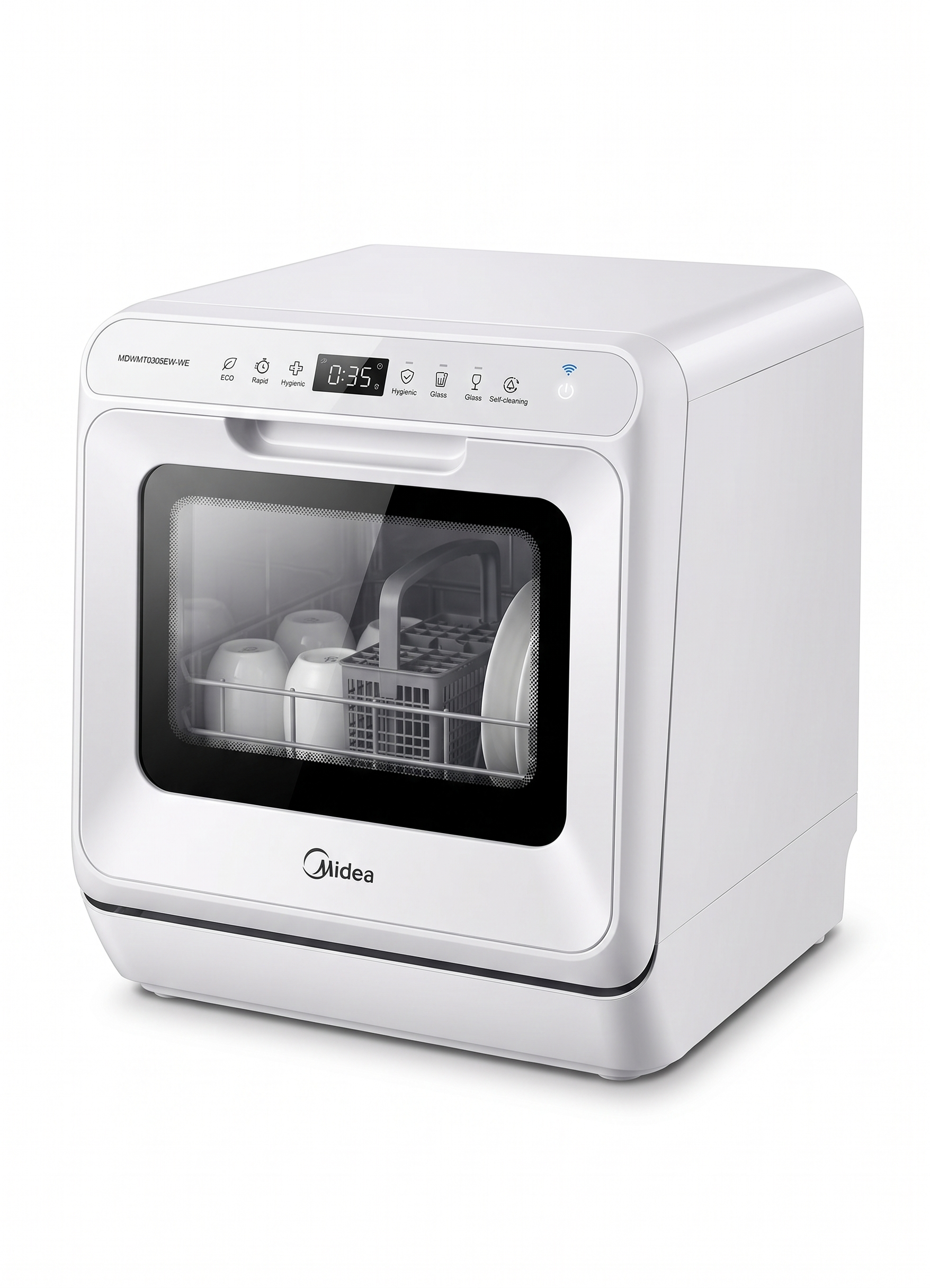 Zmywarka Midea MDWMT0305EW-WE to synonim kompaktowości i nowoczesnej technologii. Urządzenie zostało zaprojektowane z myślą o użytkownikach ceniących oszczędność miejsca oraz energooszczędność. Pomimo niewielkich rozmiarów, mieści do 4 kompletów naczyń, co czyni ją idealnym wyborem dla singli, par lub użytkowników kamperów.