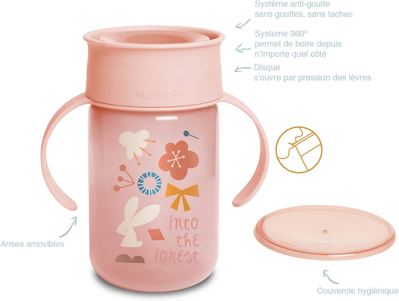 - System 360° Leak-Proof Edge: Specjalna konstrukcja pozwala na picie z dowolnego miejsca wokół krawędzi. Płyn wypływa tylko wtedy, gdy usta dziecka docisną silikonowy dysk, co uczy naturalnego odruchu picia.
