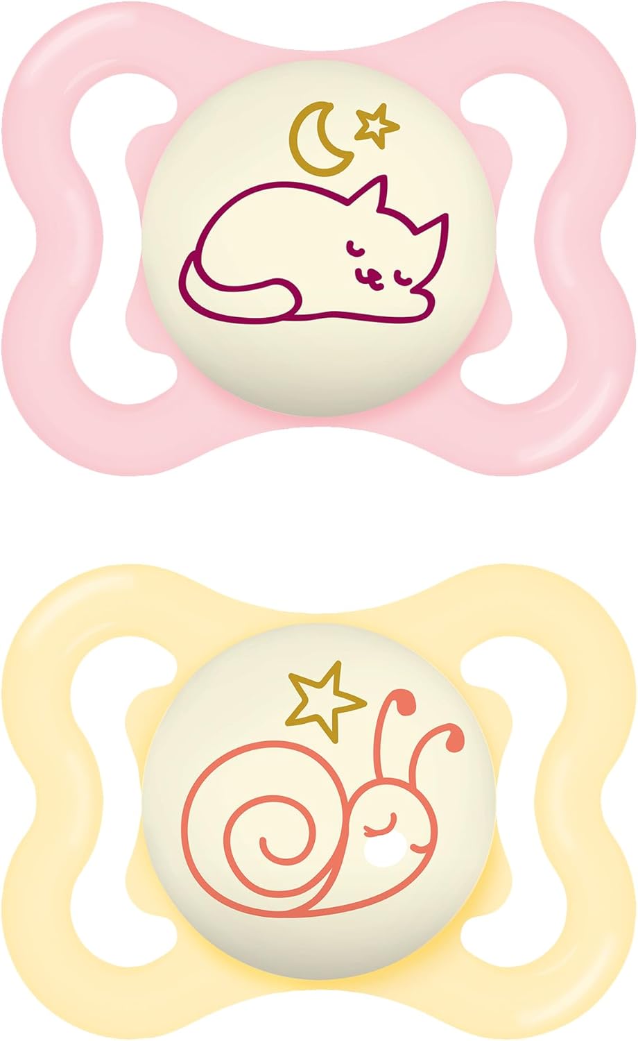- Funkcja Night (Świecenie w ciemności): Przycisk smoczka świeci delikatnym światłem, co pozwala szybko odnaleźć go w nocy bez zapalania światła i wybudzania dziecka.