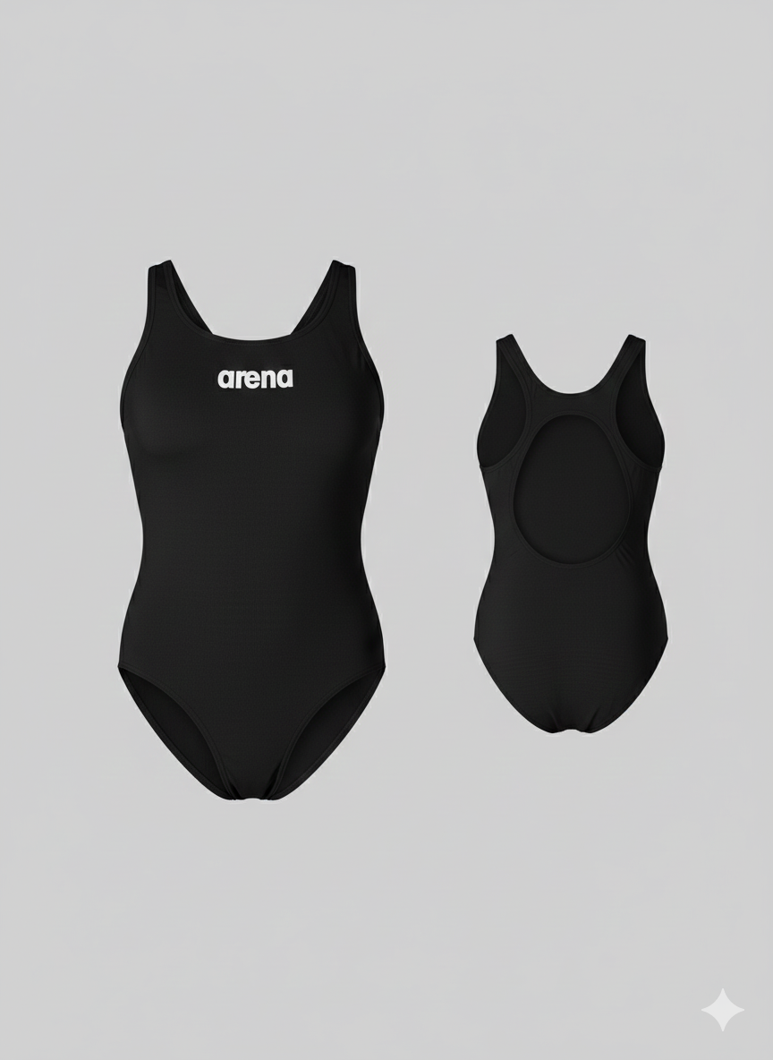 Na sprzedaż fabrycznie nowy, jednoczęściowy strój kąpielowy renomowanej marki Arena, model Team Swimsuit Swim Tech Solid w klasycznym czarnym kolorze z białym logo.