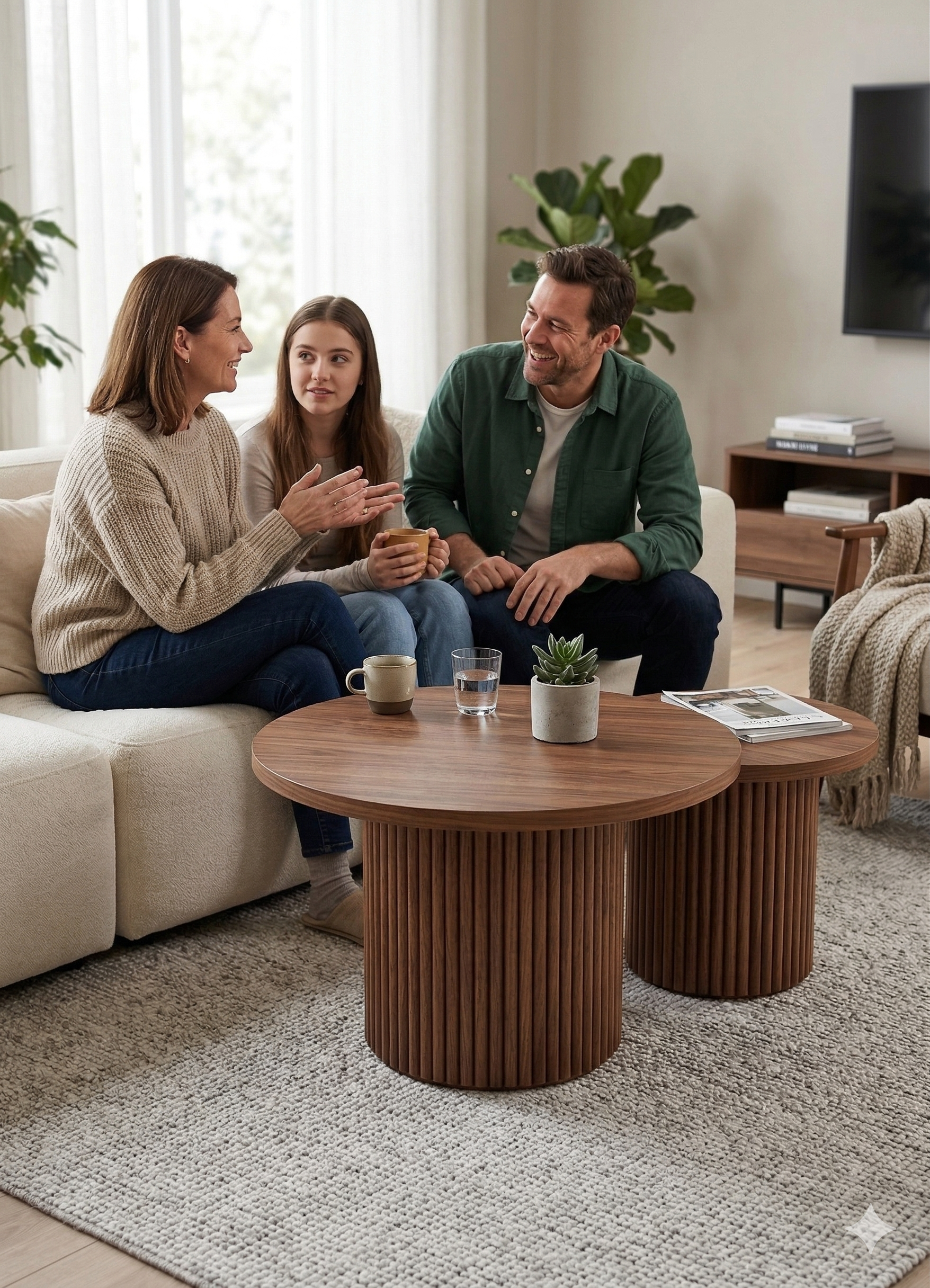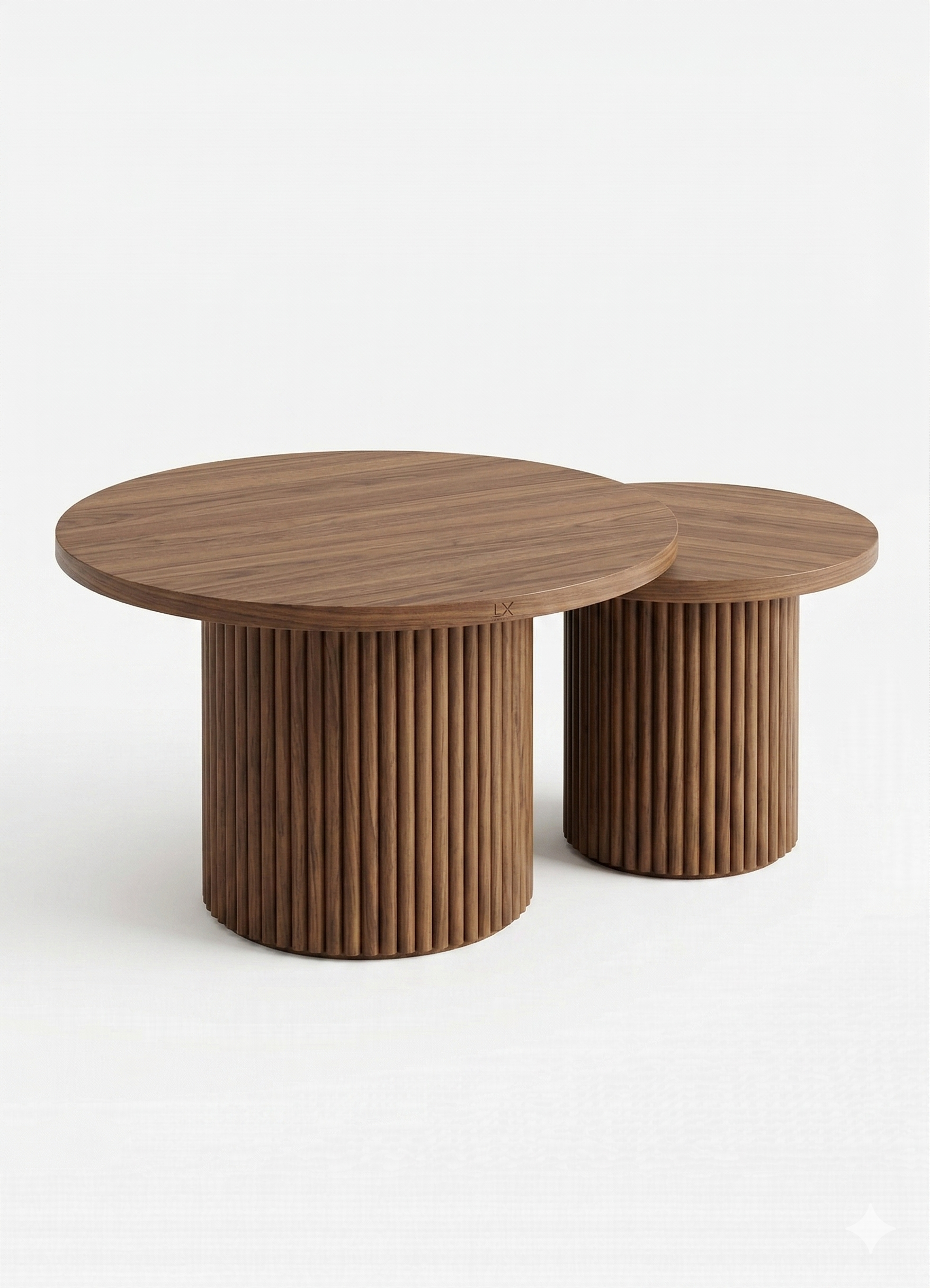 Wprowadź do swojego salonu powiew luksusu i nowoczesnego designu. Zestaw dwóch okrągłych stolików kawowych to idealne połączenie minimalistycznej formy z najgorętszym trendem wnętrzarskim ostatnich sezonów – pionowymi ryflowaniami. Głęboki, ciepły odcień orzecha (Walnut) nadaje wnętrzu przytulności, a jednocześnie podkreśla prestiżowy charakter pomieszczenia.