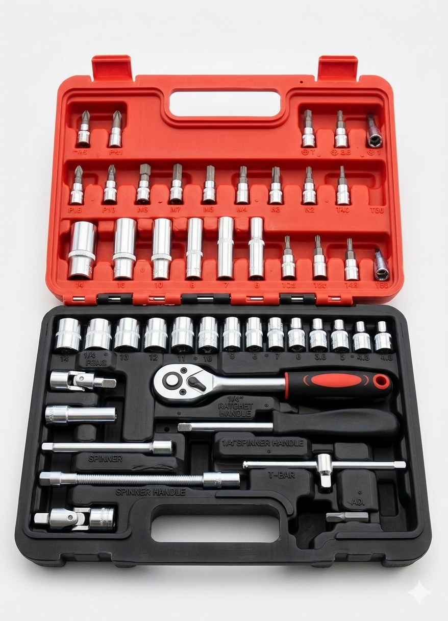 Niezastąpiony zestaw narzędziowy stworzony z myślą o precyzyjnych pracach mechanicznych, domowych naprawach oraz majsterkowaniu. Komplet składa się z 46 starannie wyselekcjonowanych elementów, w tym precyzyjnej grzechotki 1/4″ z ergonomiczną, antypoślizgową rękojeścią, która gwarantuje pewny chwyt i komfort pracy nawet w trudnodostępnych miejscach. Wszystkie elementy wykonane są z wysokogatunkowej stali, co zapewnia wyjątkową trwałość i odporność na odkształcenia. Całość została zamknięta w kompaktowej, wytrzymałej walizce z tworzywa sztucznego, która ułatwia transport i utrzymanie idealnego porządku w warsztacie lub bagażniku samochodu.